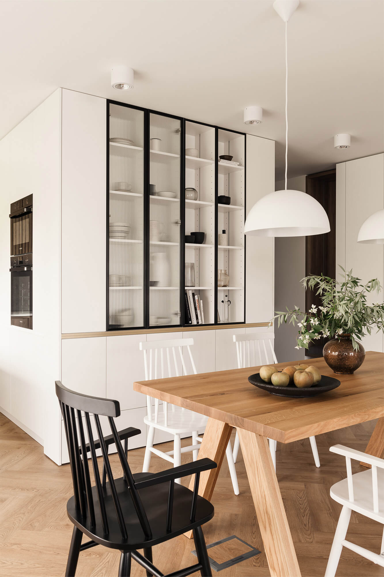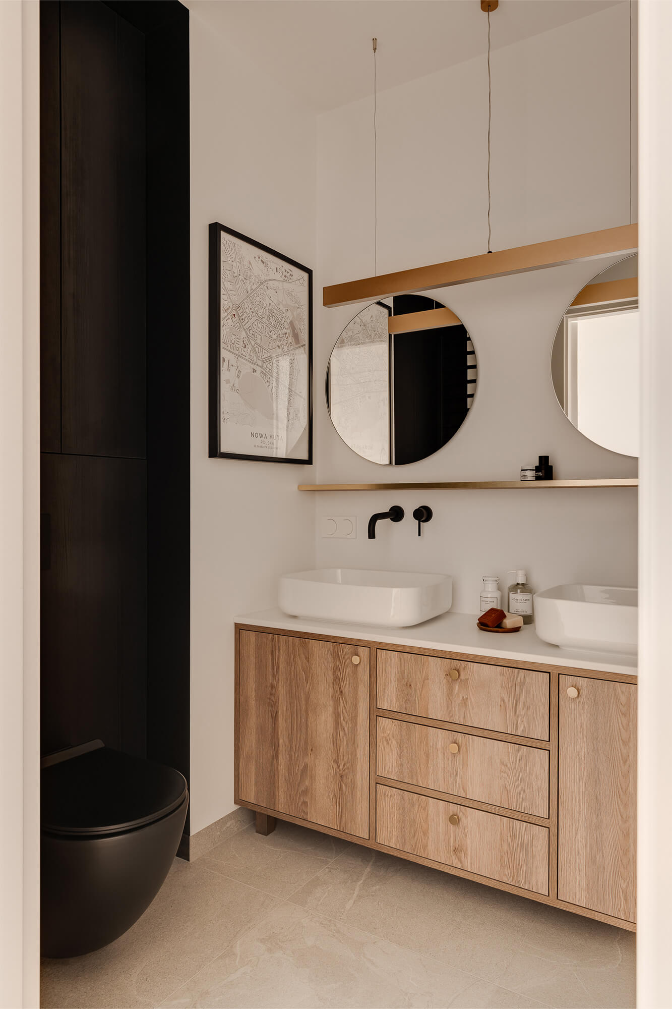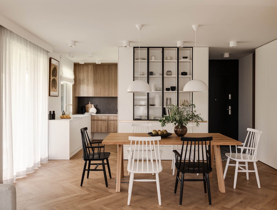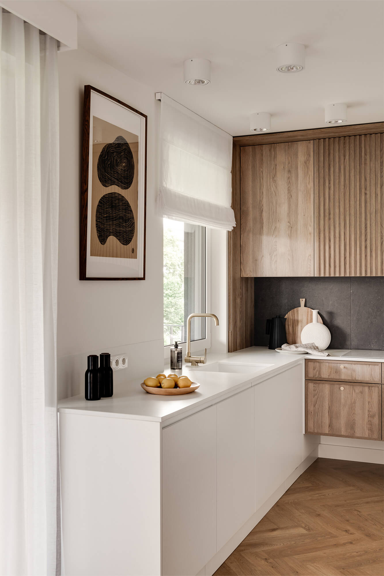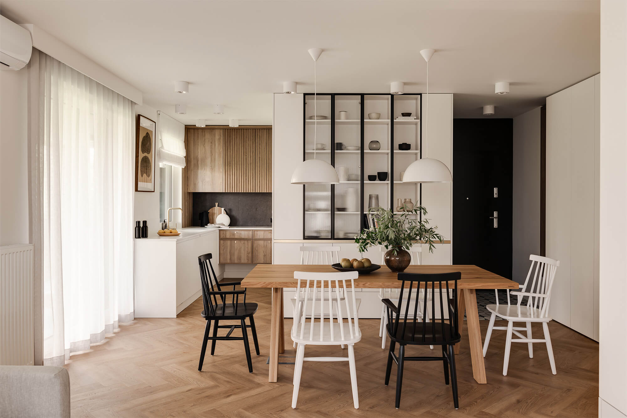 Czerń i biel to klasyczne połączenie, które nadaje mieszkaniu elegancji i charakteru. Dominującą rolę odgrywa biel, a czerń wprowadza wyraziste akcenty, widoczne m.in. w płytkach kuchennych między blatem a szafkami, w strefie RTV oraz w łazience, za toaletą. W sypialni króluje biel, wzbogacona subtelnymi odcieniami szałwii. Całość ocieplają drewniane elementy, tworząc harmonijną i przytulną przestrzeń.