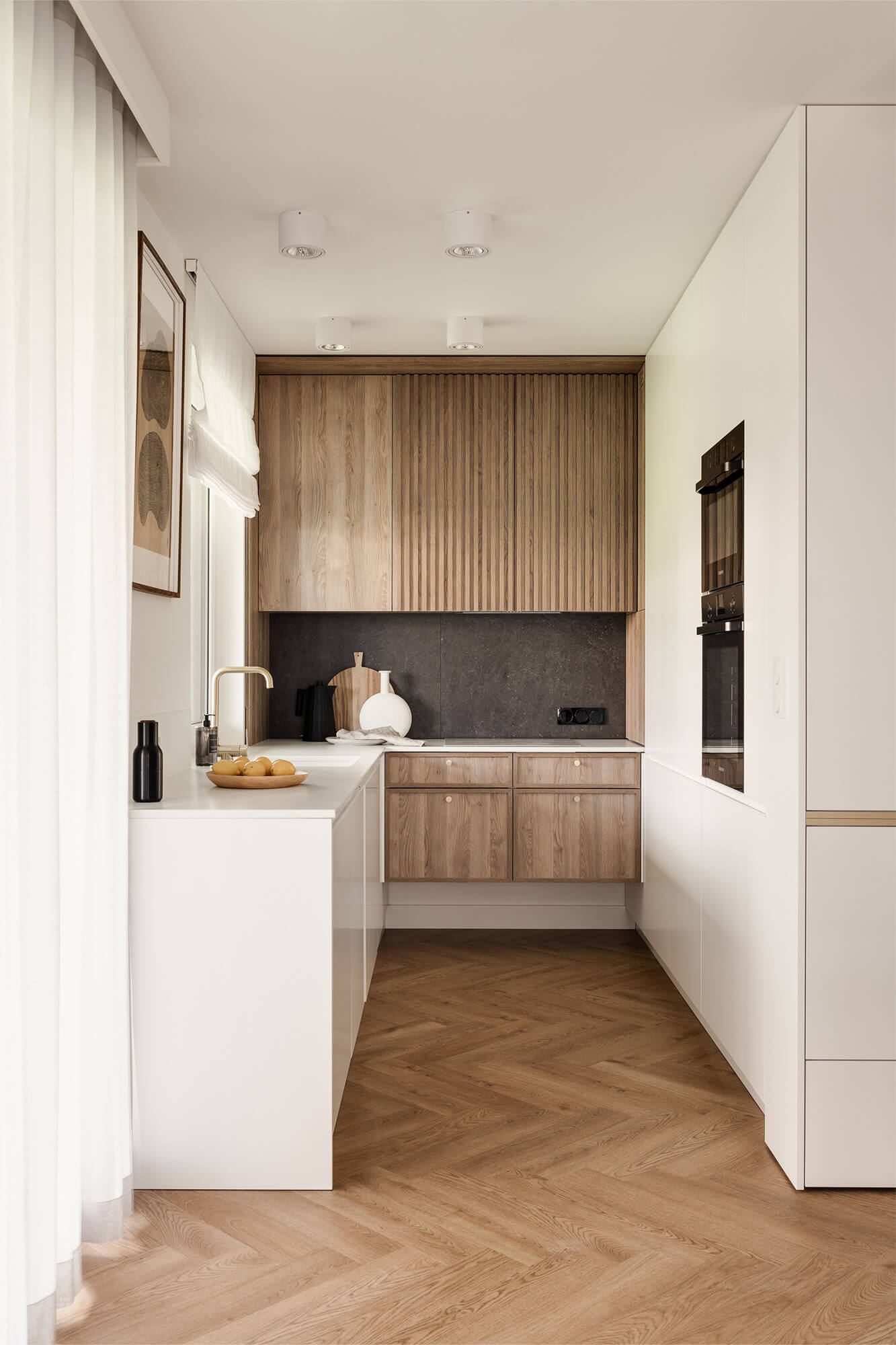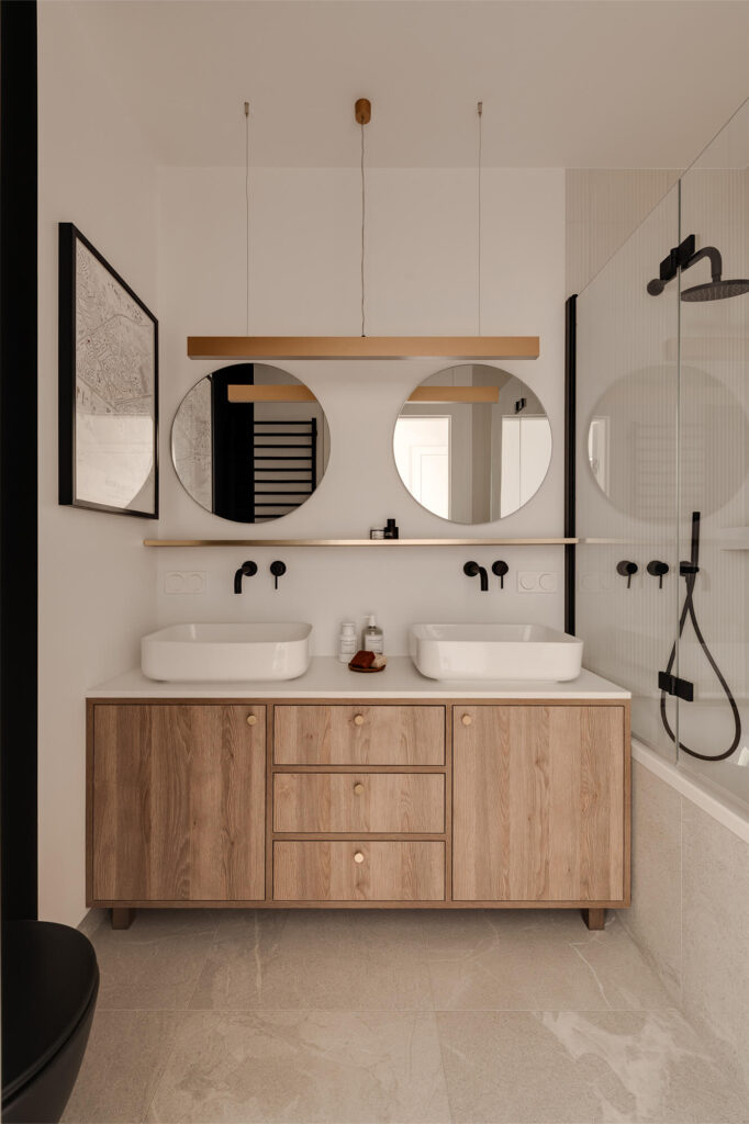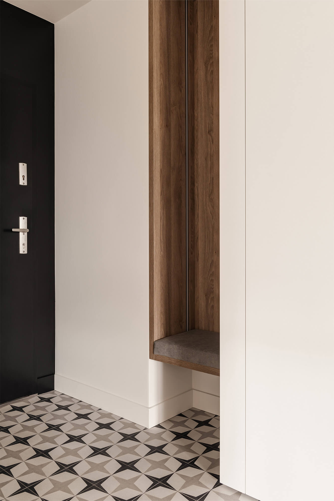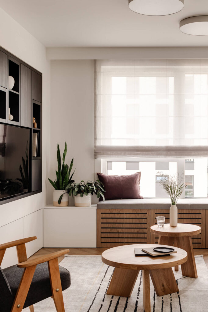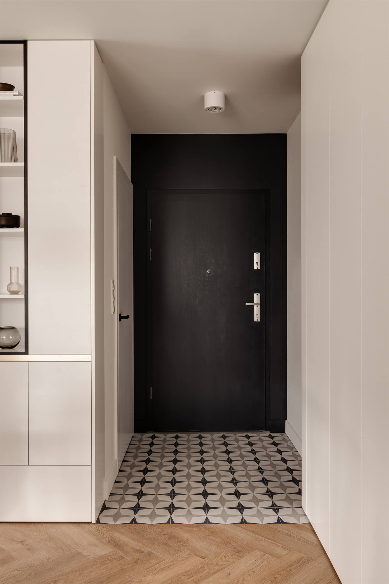 Czerń i biel to klasyczne połączenie, które nadaje mieszkaniu elegancji i charakteru. Dominującą rolę odgrywa biel, a czerń wprowadza wyraziste akcenty, widoczne m.in. w płytkach kuchennych między blatem a szafkami, w strefie RTV oraz w łazience, za toaletą. W sypialni króluje biel, wzbogacona subtelnymi odcieniami szałwii. Całość ocieplają drewniane elementy, tworząc harmonijną i przytulną przestrzeń.