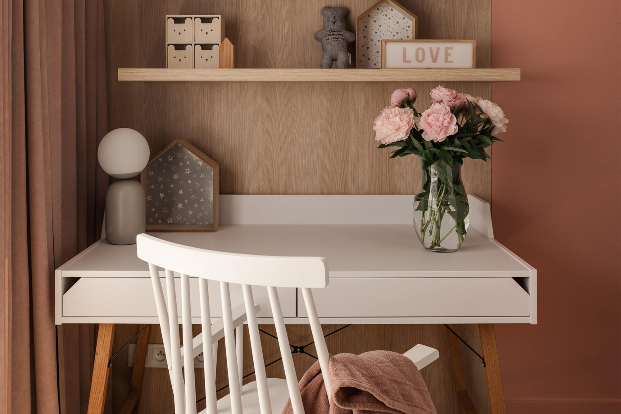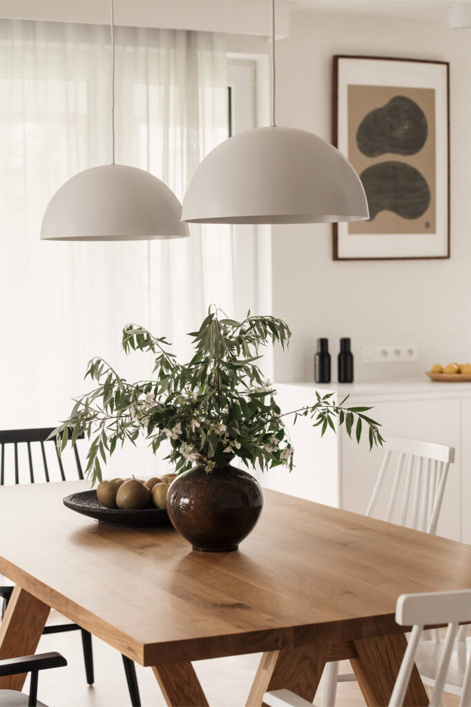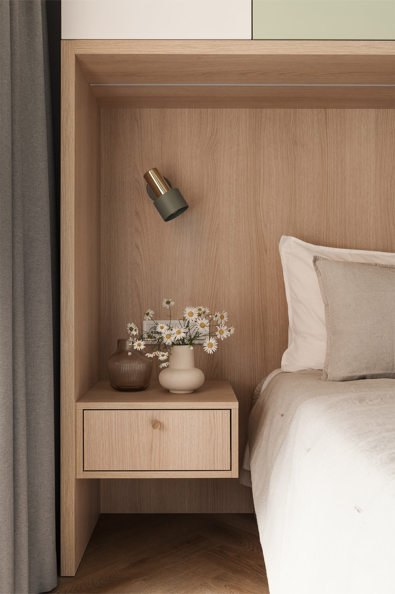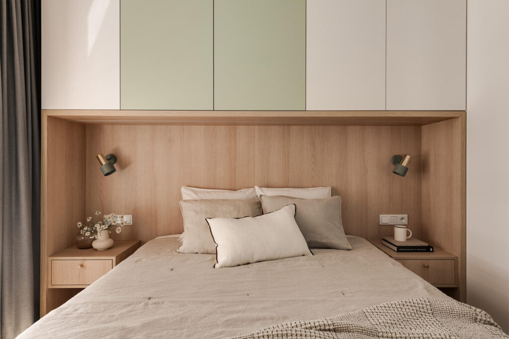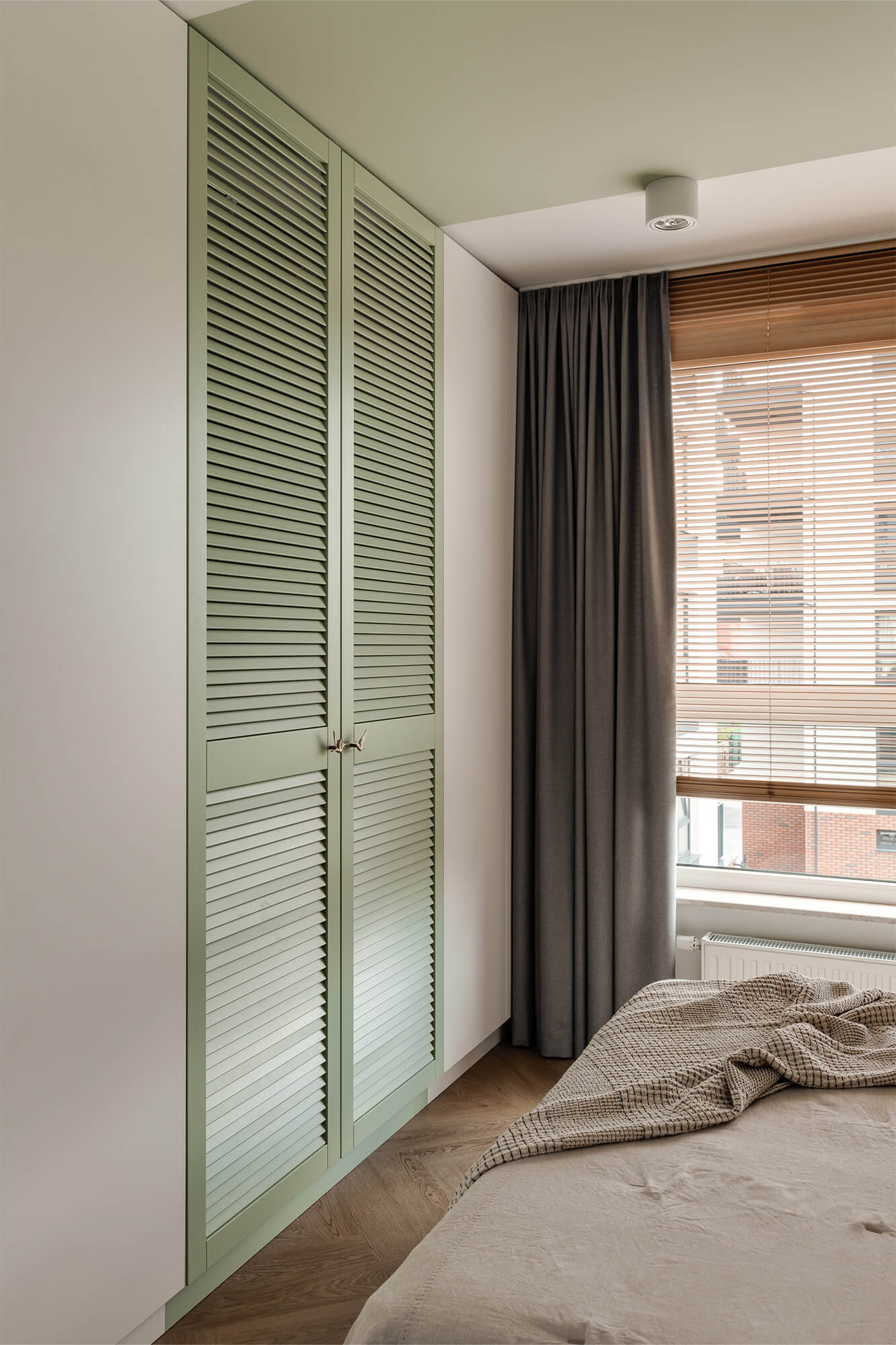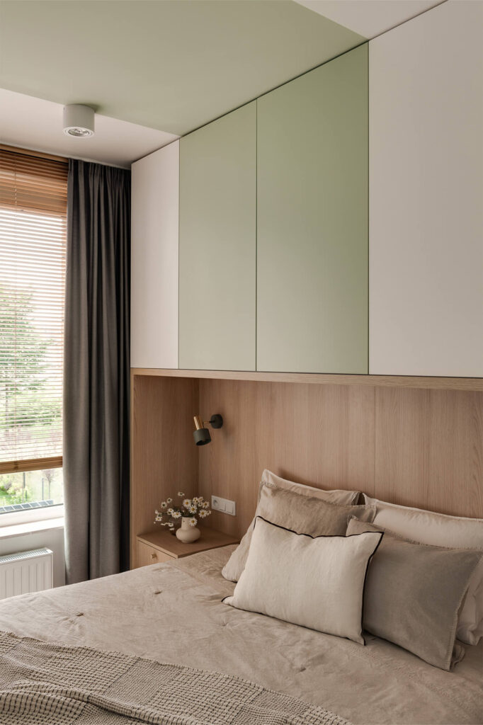 Czerń i biel to klasyczne połączenie, które nadaje mieszkaniu elegancji i charakteru. Dominującą rolę odgrywa biel, a czerń wprowadza wyraziste akcenty, widoczne m.in. w płytkach kuchennych między blatem a szafkami, w strefie RTV oraz w łazience, za toaletą. W sypialni króluje biel, wzbogacona subtelnymi odcieniami szałwii. Całość ocieplają drewniane elementy, tworząc harmonijną i przytulną przestrzeń.