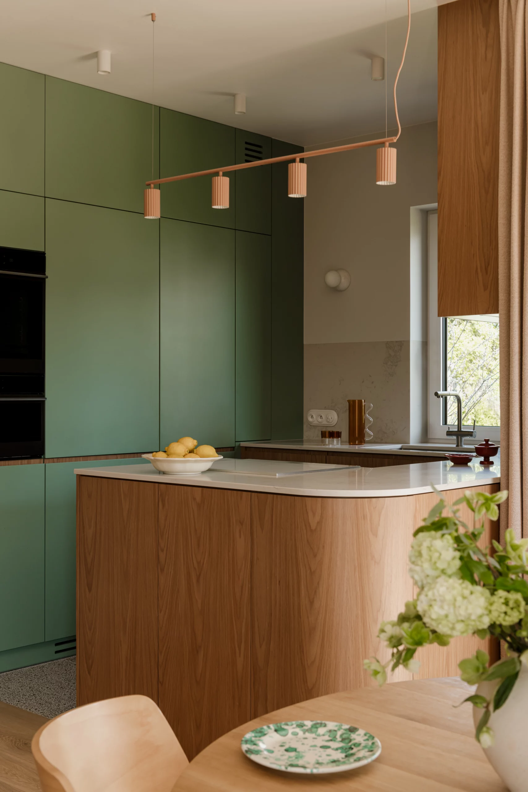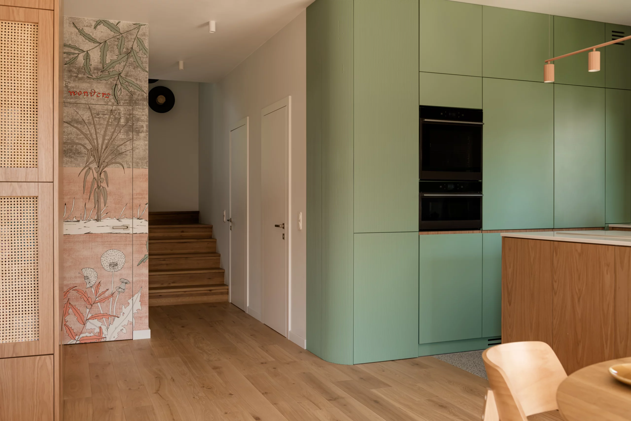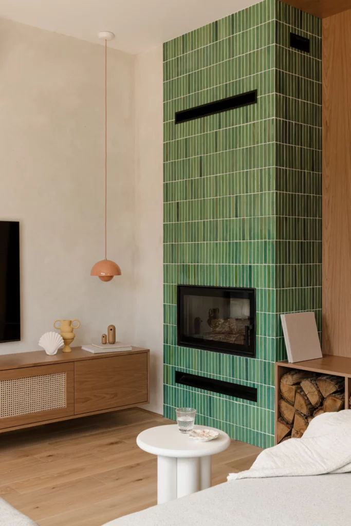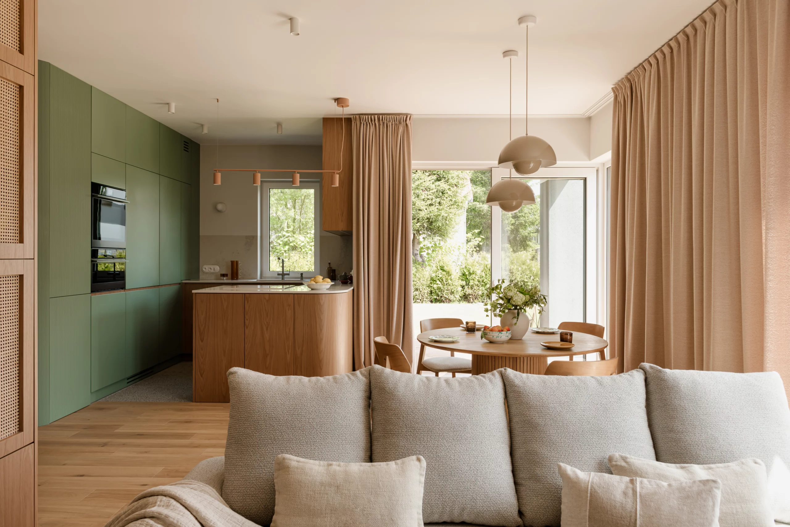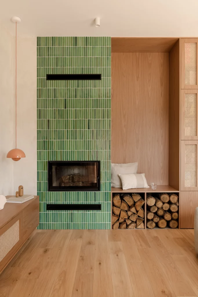 Projekt wnętrza opiera się na pastelowych odcieniach zieleni oraz ciepłych tonach dębowego drewna, które wprowadzają do przestrzeni naturalność i harmonię. Stonowana paleta barw sprzyja wyciszeniu i tworzy spokojną atmosferę. Główną ozdobą części wypoczynkowej jest kominek, wykończony ręcznie wykonanymi płytkami, nadającymi wnętrzu unikalny, artystyczny charakter.