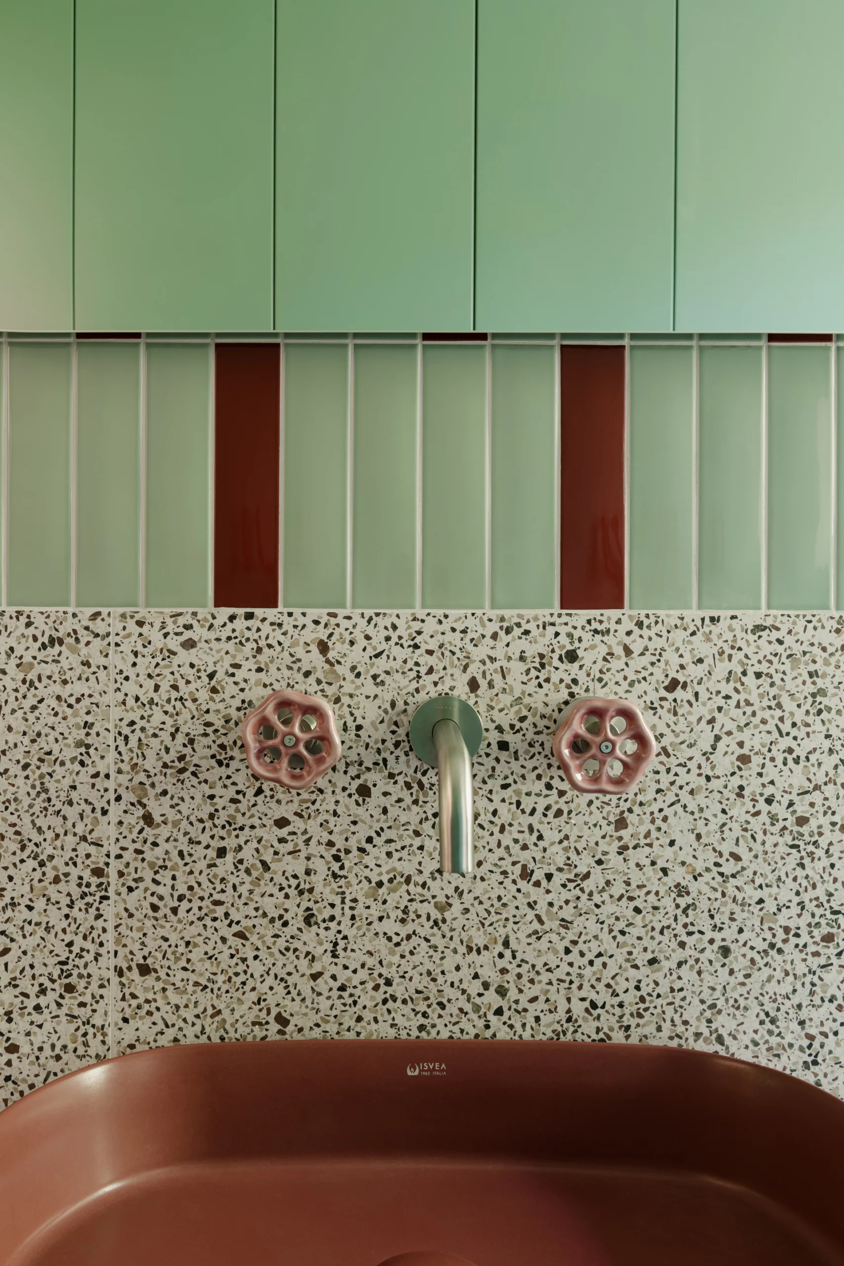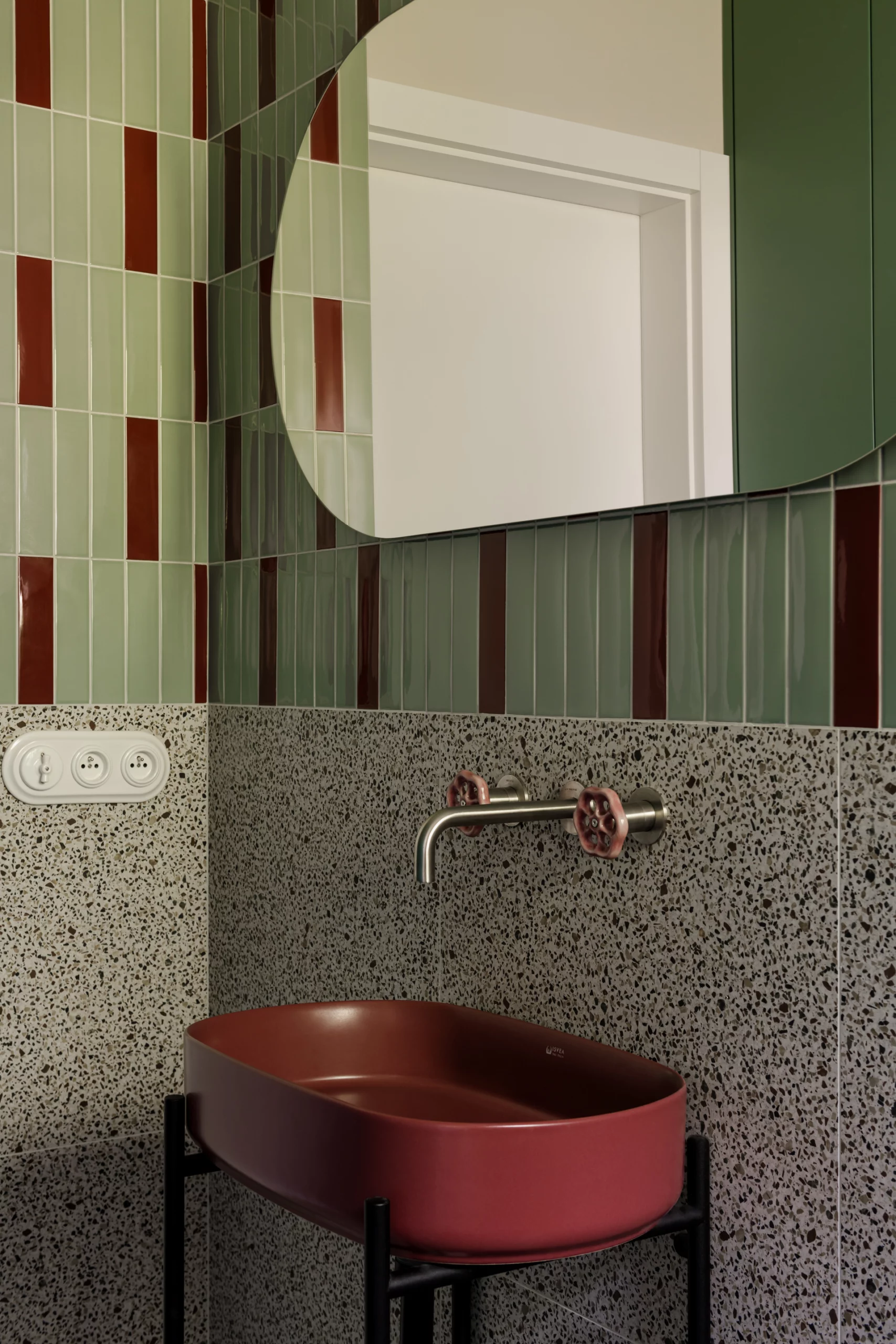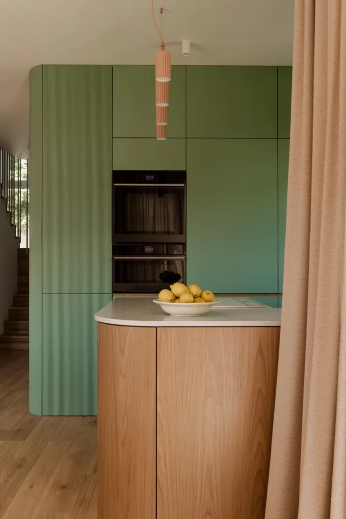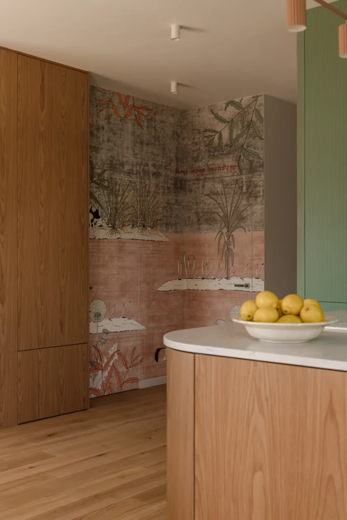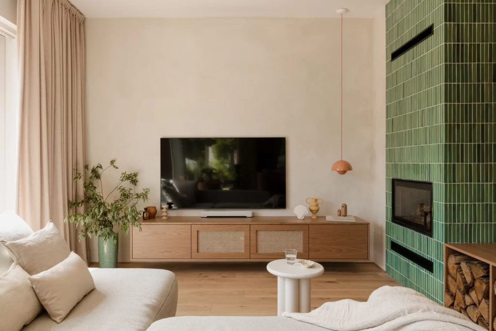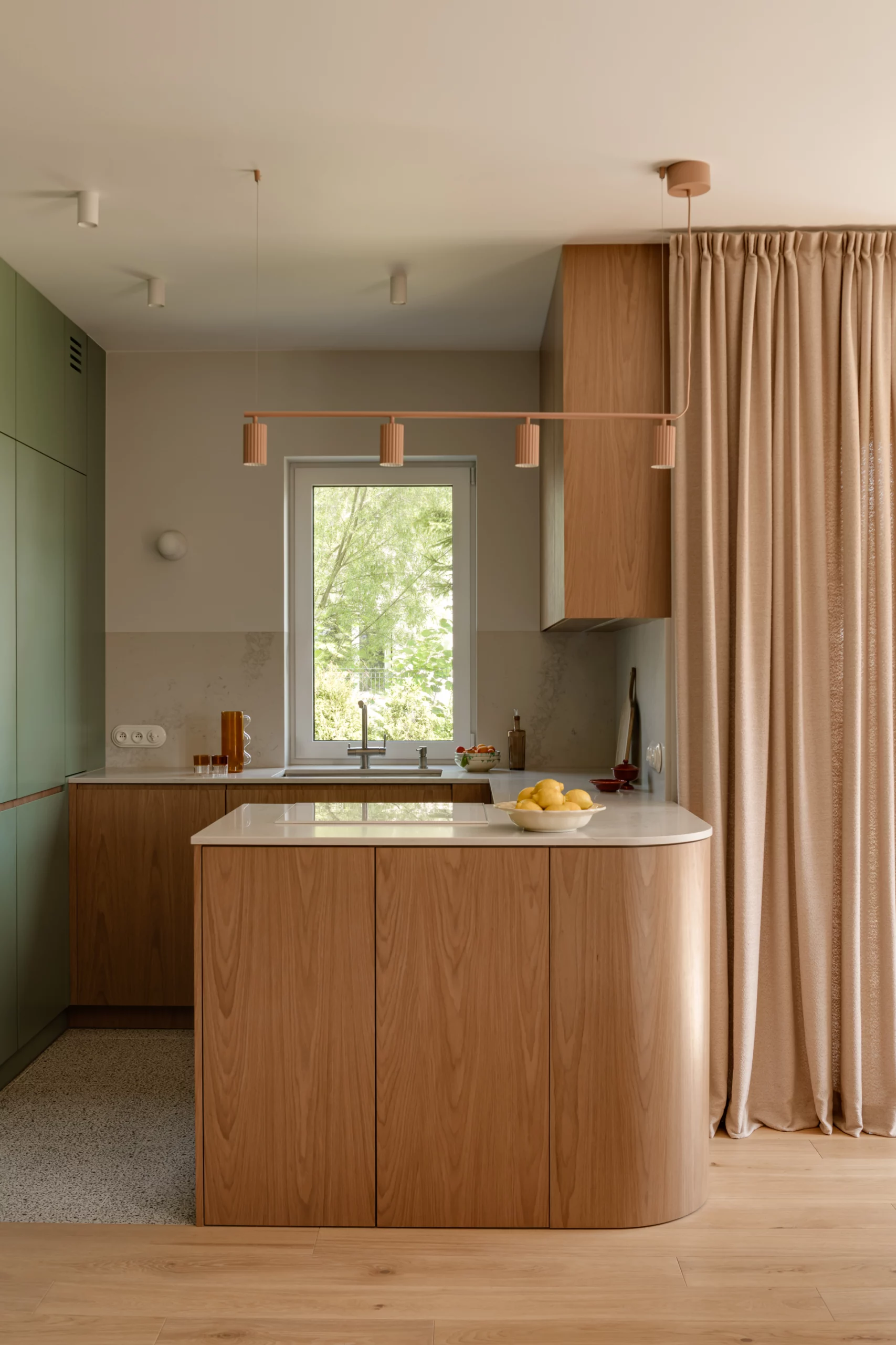 Projekt wnętrza opiera się na pastelowych odcieniach zieleni oraz ciepłych tonach dębowego drewna, które wprowadzają do przestrzeni naturalność i harmonię. Stonowana paleta barw sprzyja wyciszeniu i tworzy spokojną atmosferę. Główną ozdobą części wypoczynkowej jest kominek, wykończony ręcznie wykonanymi płytkami, nadającymi wnętrzu unikalny, artystyczny charakter.
