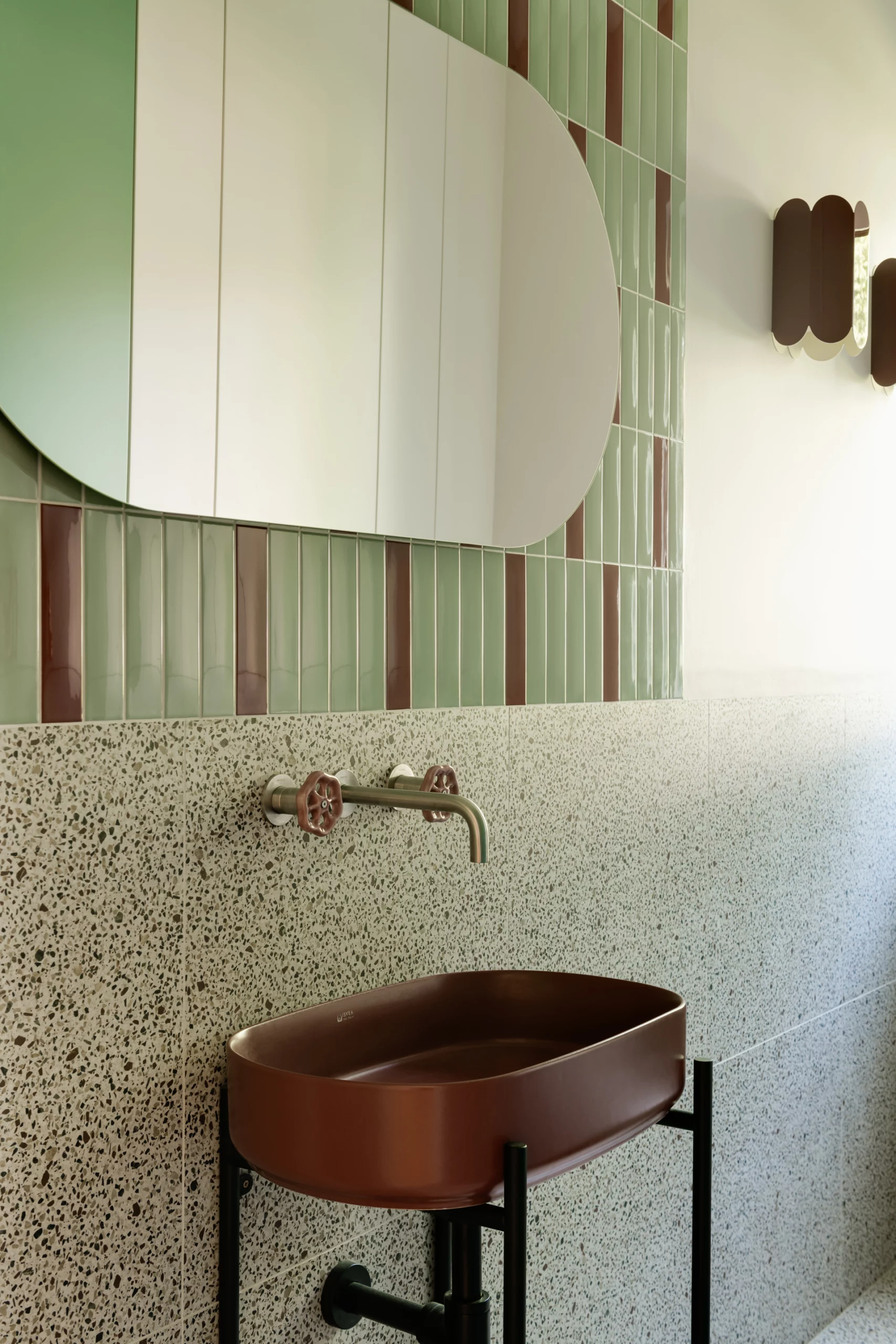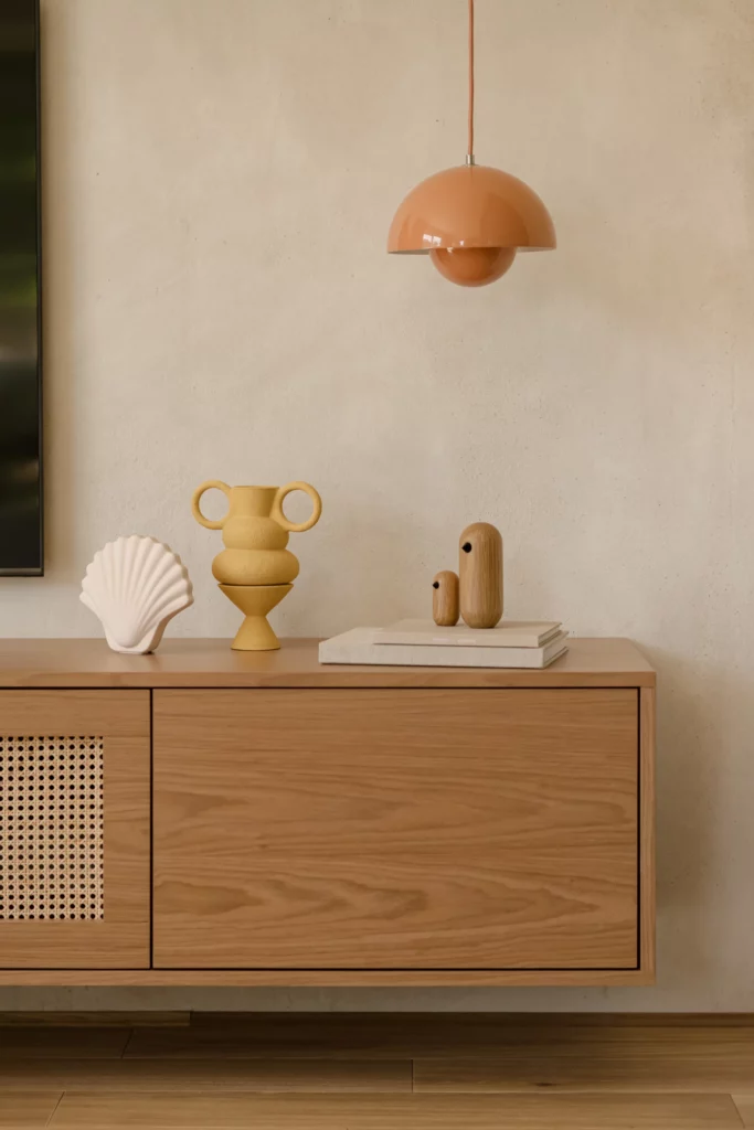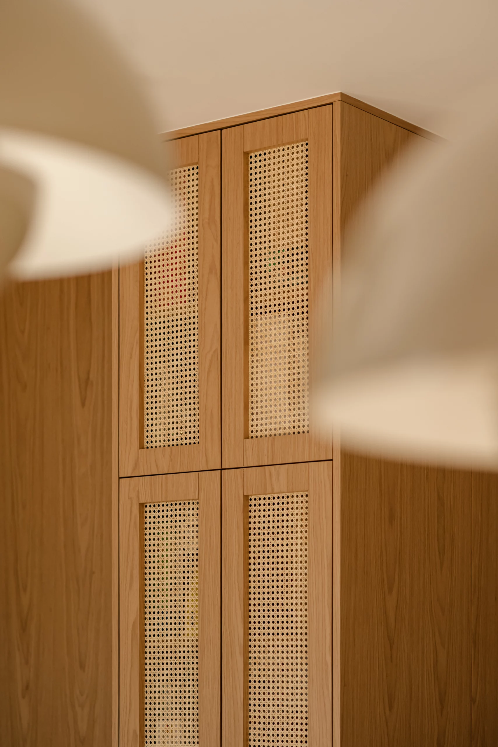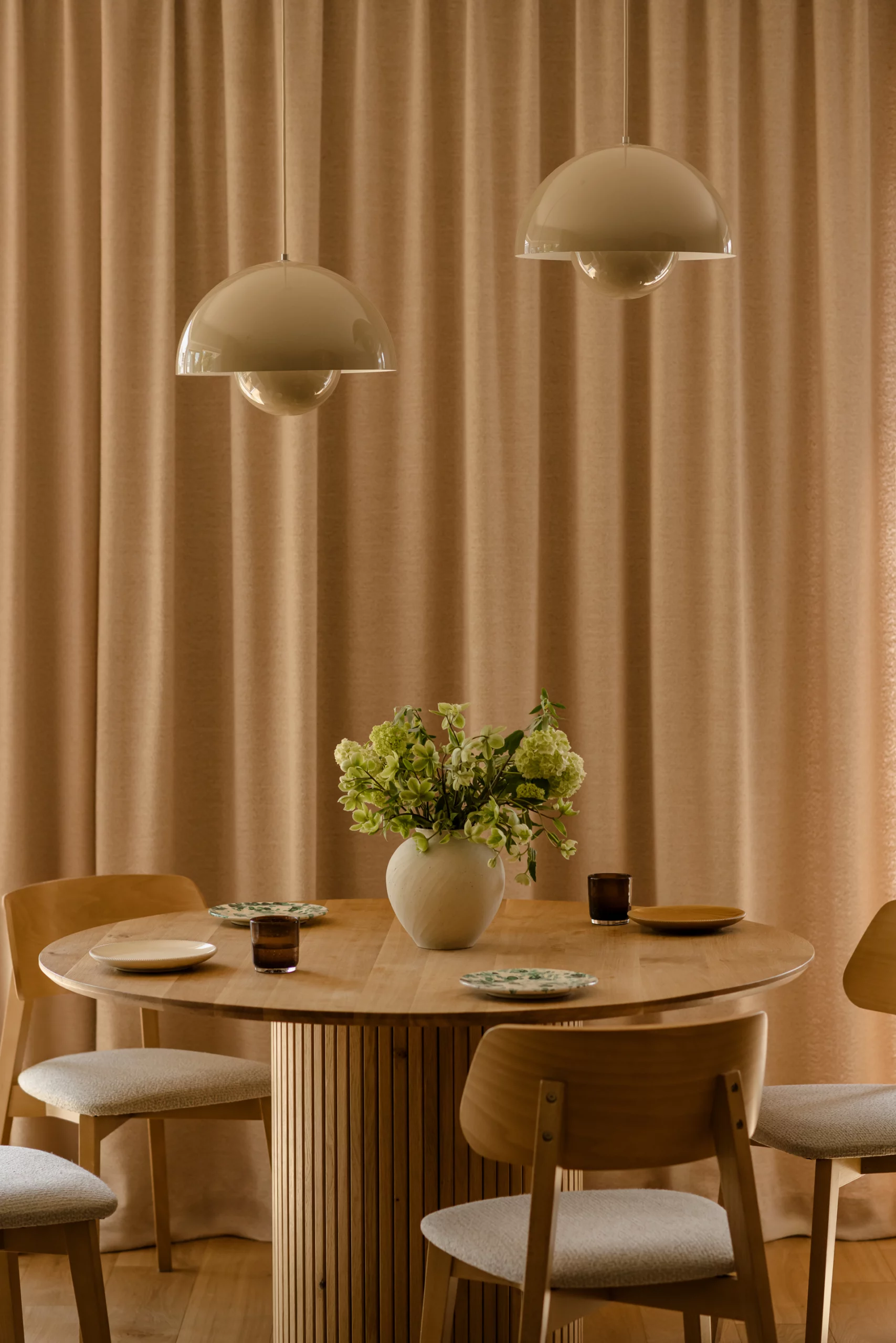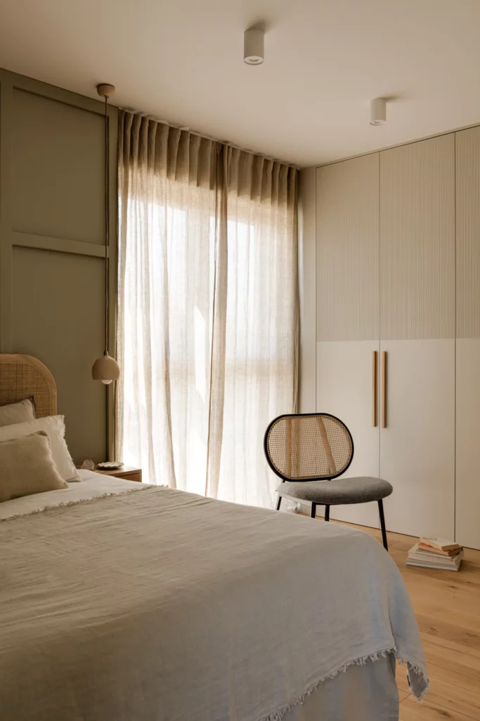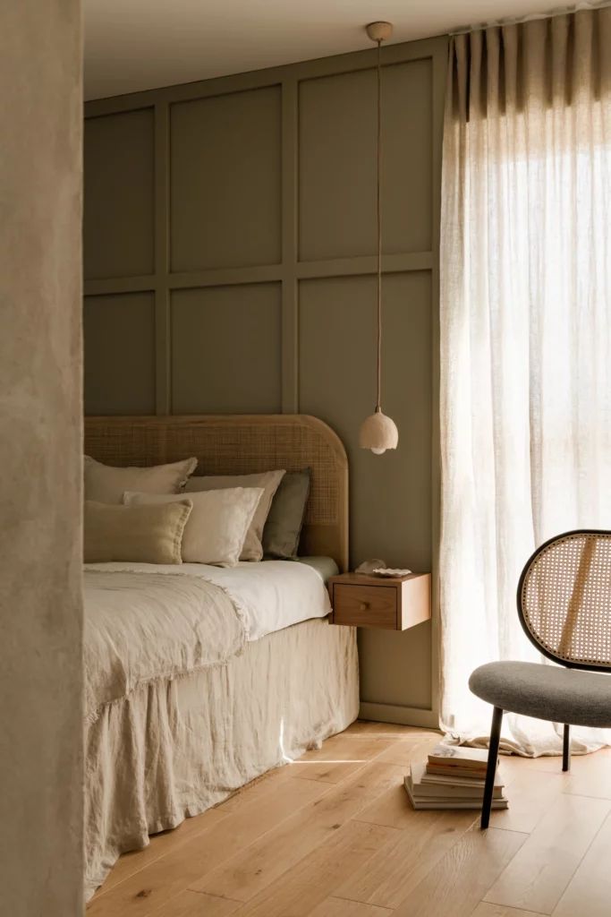 Projekt wnętrza opiera się na pastelowych odcieniach zieleni oraz ciepłych tonach dębowego drewna, które wprowadzają do przestrzeni naturalność i harmonię. Stonowana paleta barw sprzyja wyciszeniu i tworzy spokojną atmosferę. Główną ozdobą części wypoczynkowej jest kominek, wykończony ręcznie wykonanymi płytkami, nadającymi wnętrzu unikalny, artystyczny charakter.