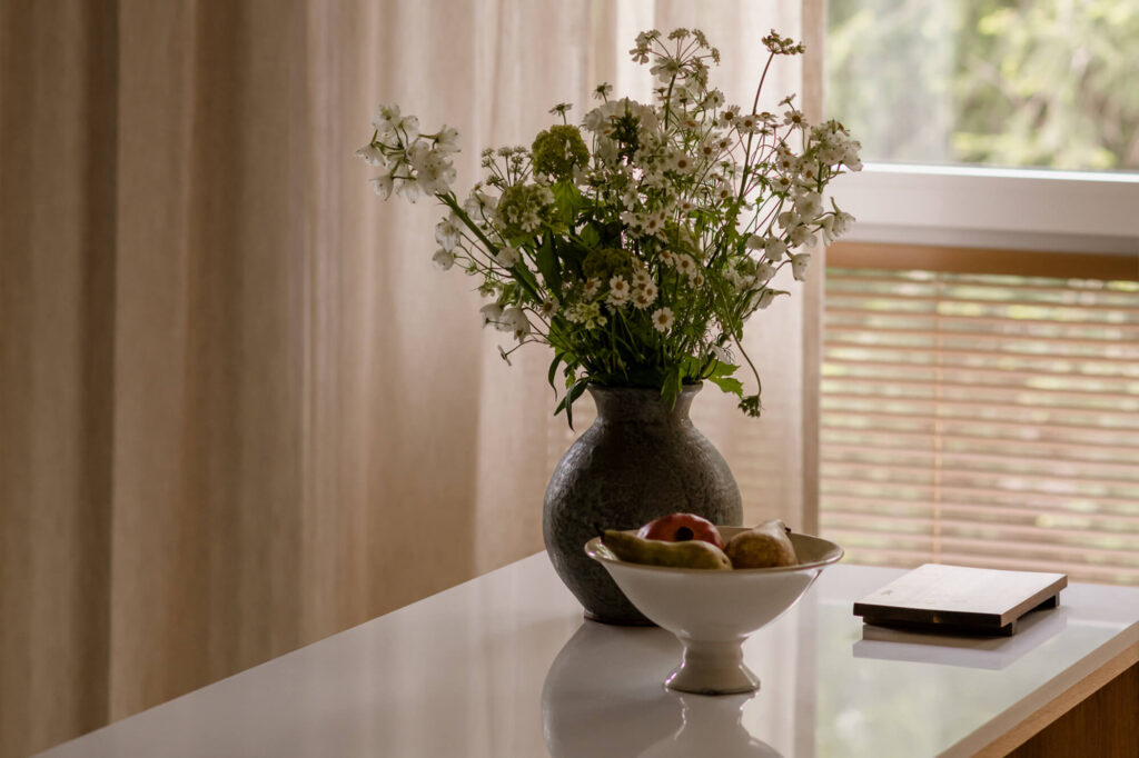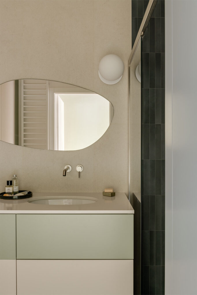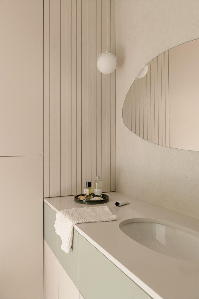 Mieszkanie pełne światła, naturalnych materiałów i kolorów. To wnętrze, które zaprasza do odpoczynku i relaksu. Dąb nadaje tej przestrzeni niepowtarzalny charakter. Jego obecność podkreśla ciepły, zielony kolor zabudowy kuchennej i przenika przez całą przestrzeń mieszkania. Aranżacja łazienki nawiązuje do motywu wody. Część prysznicowa została wyłożona bardzo drobnymi, delikatnie mieniącymi się płytkami, które dają efekt padającego deszczu.
