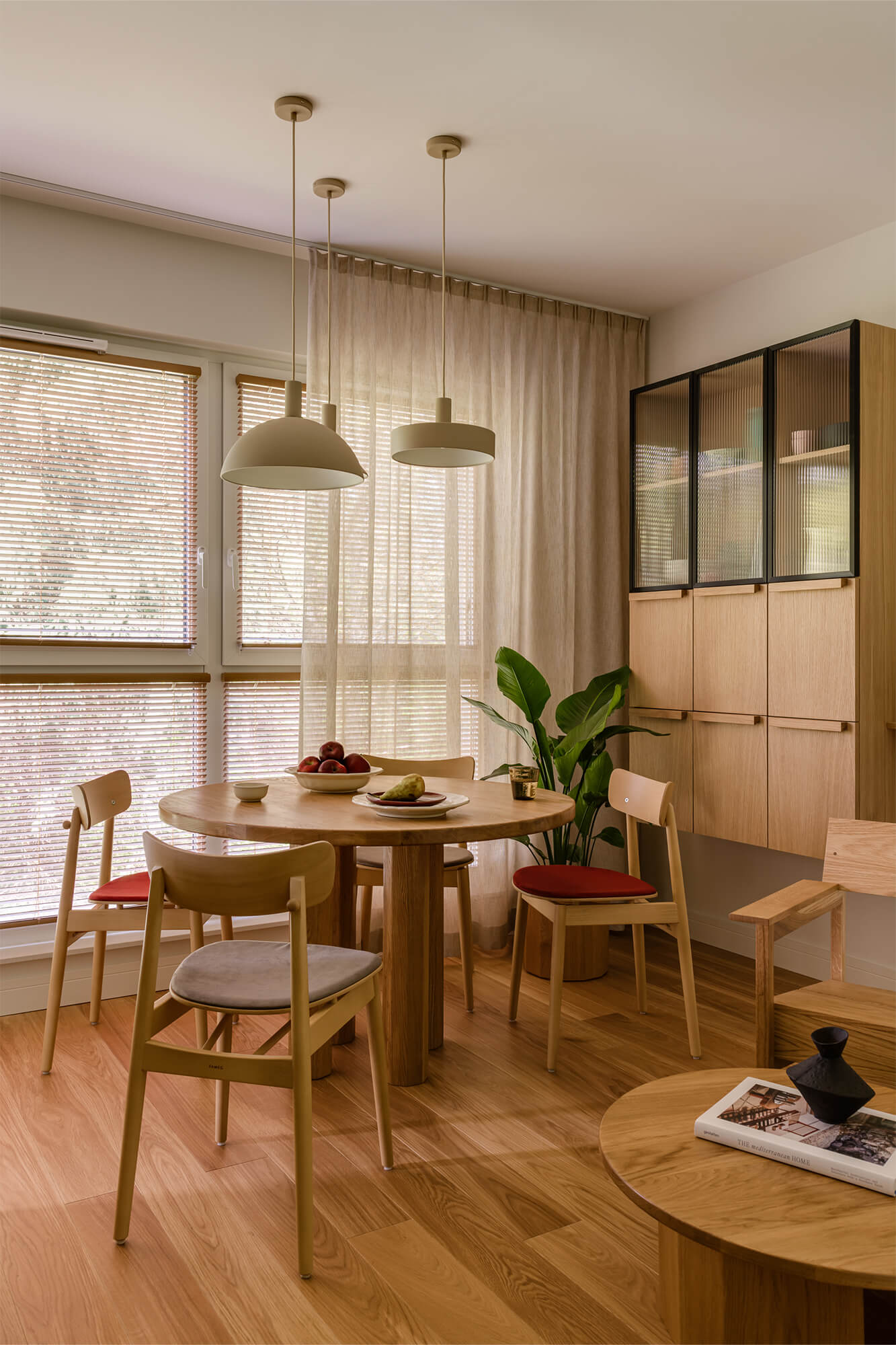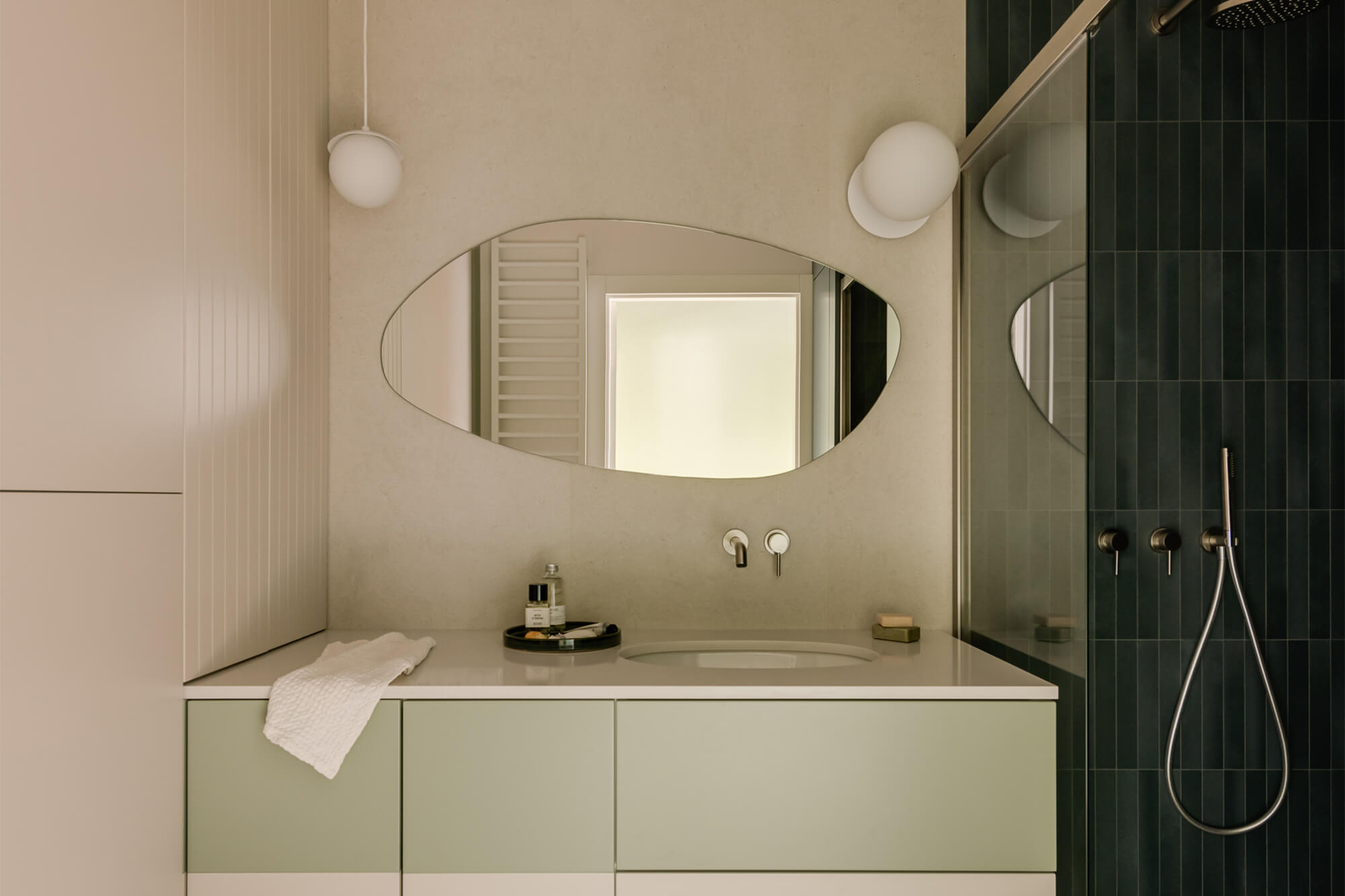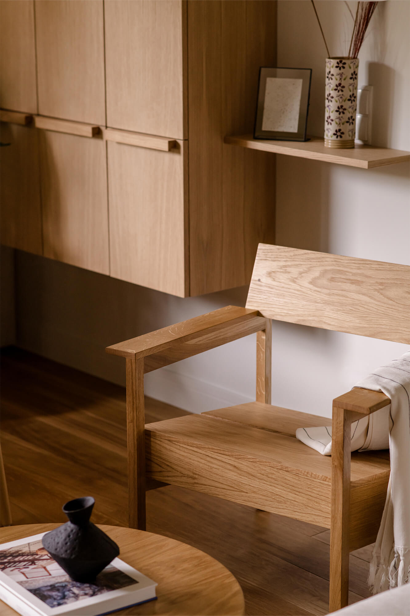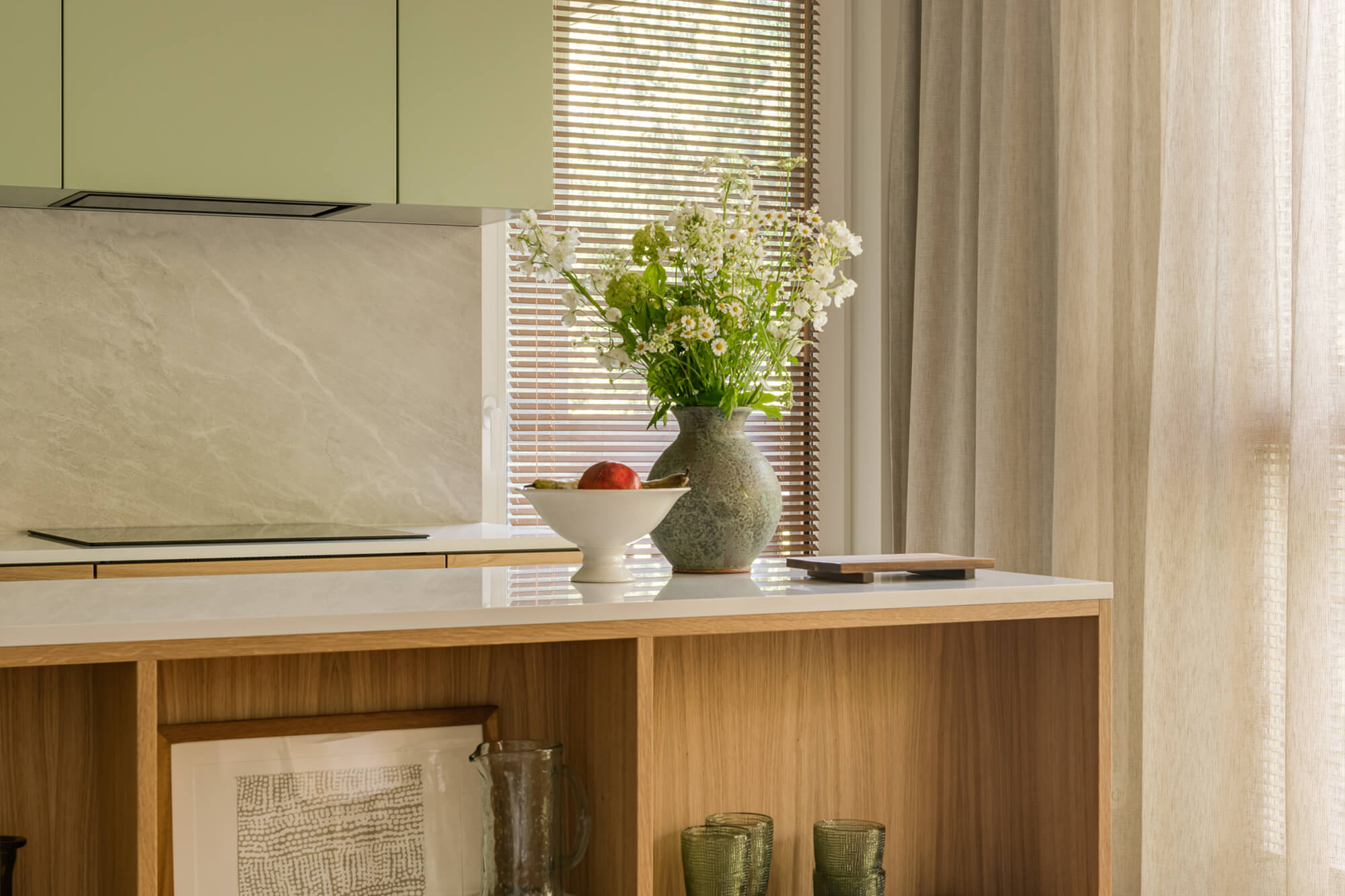 Mieszkanie pełne światła, naturalnych materiałów i kolorów. To wnętrze, które zaprasza do odpoczynku i relaksu. Dąb nadaje tej przestrzeni niepowtarzalny charakter. Jego obecność podkreśla ciepły, zielony kolor zabudowy kuchennej i przenika przez całą przestrzeń mieszkania. Aranżacja łazienki nawiązuje do motywu wody. Część prysznicowa została wyłożona bardzo drobnymi, delikatnie mieniącymi się płytkami, które dają efekt padającego deszczu.