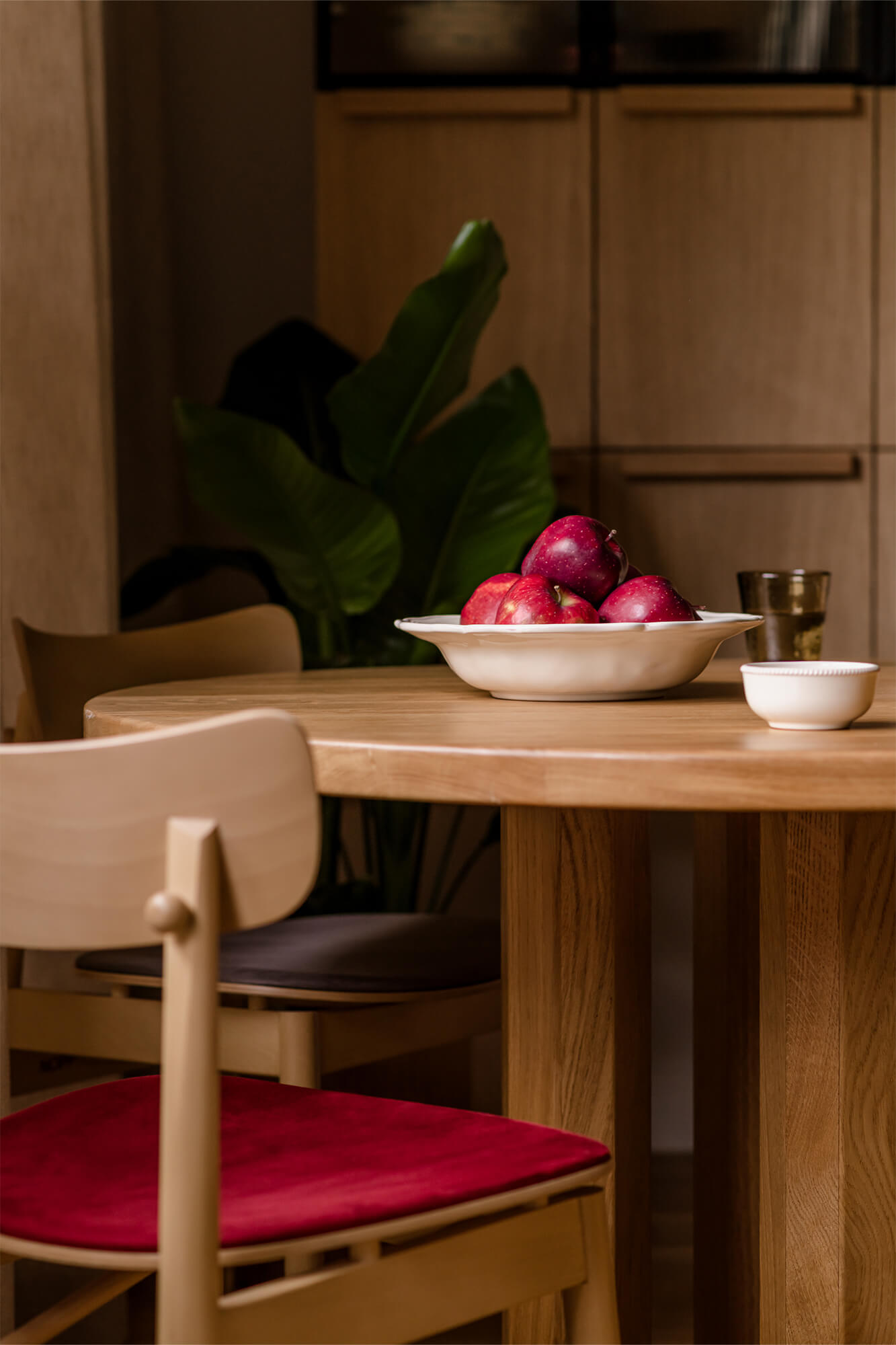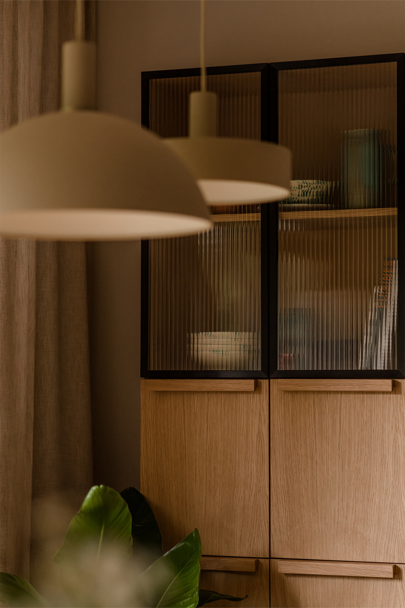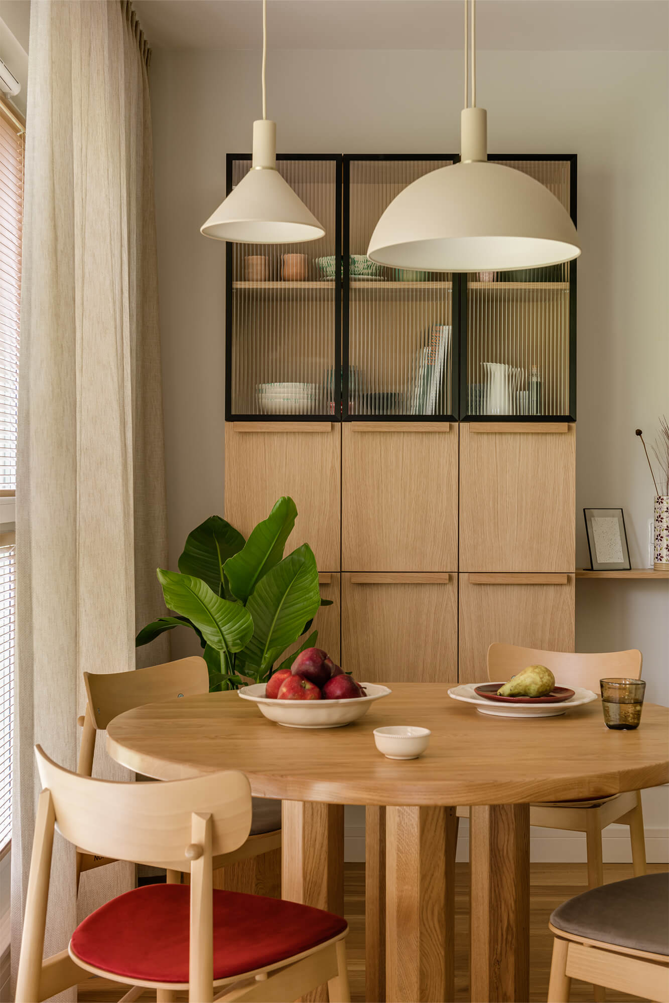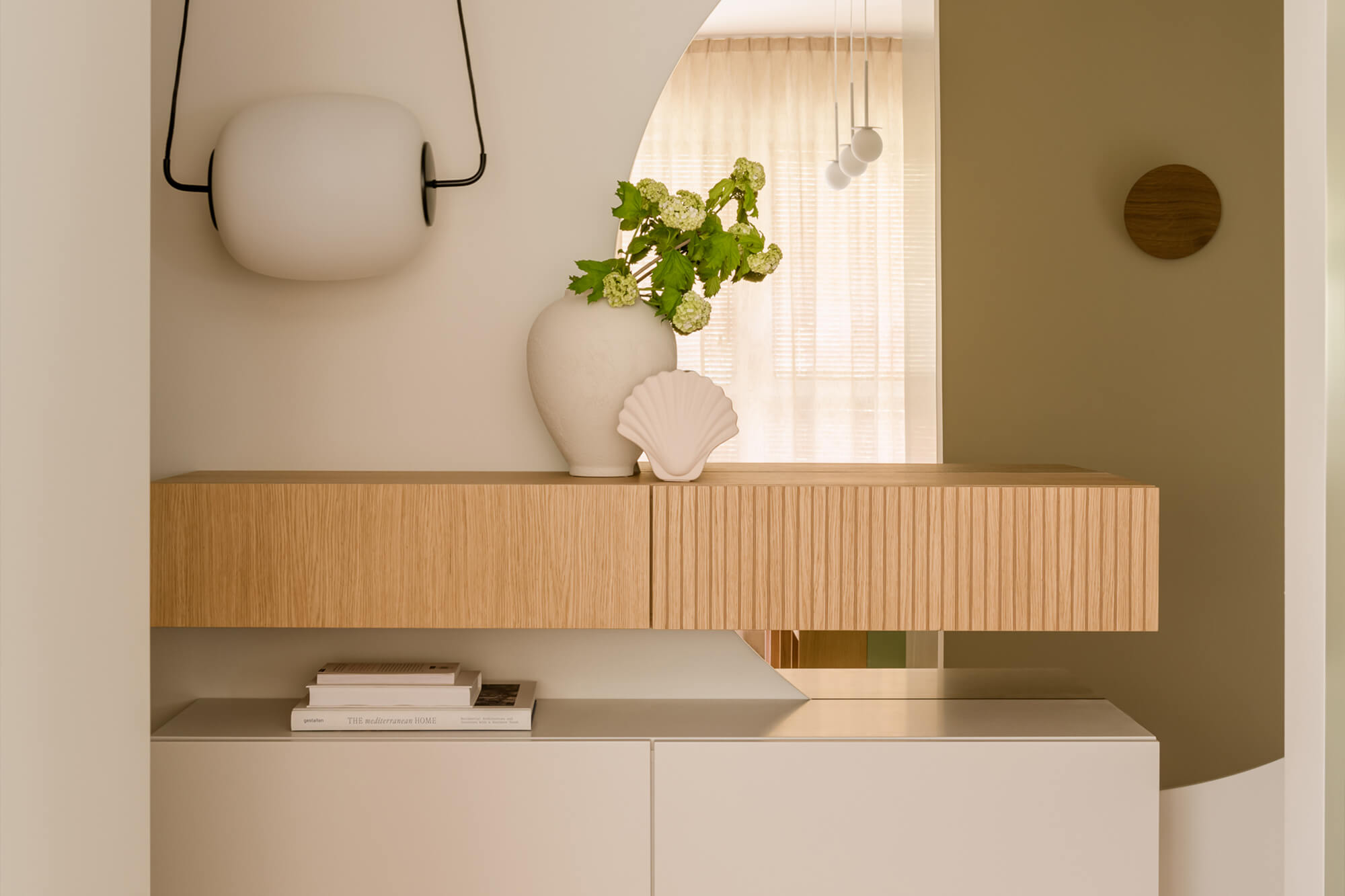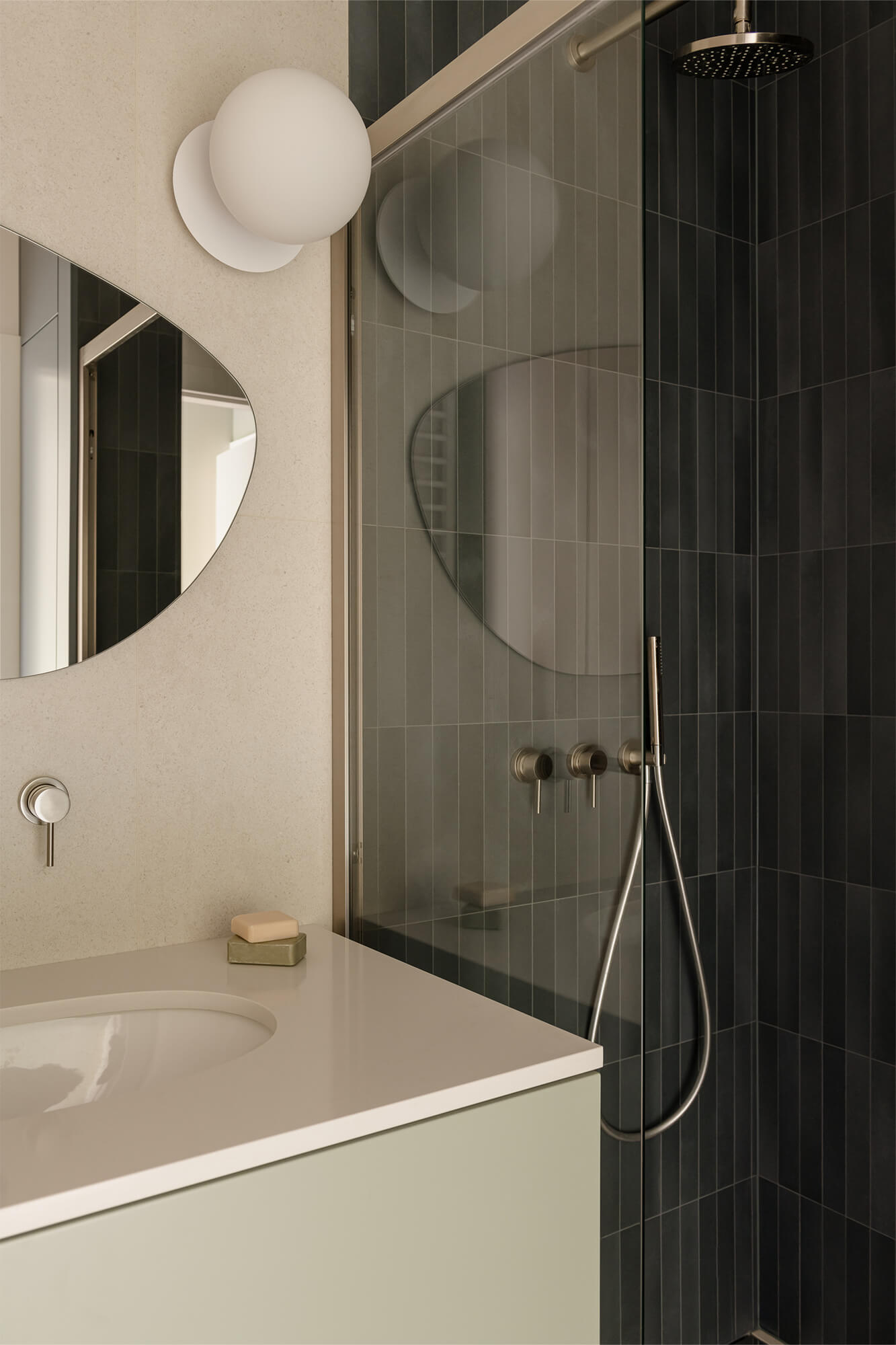 Mieszkanie pełne światła, naturalnych materiałów i kolorów. To wnętrze, które zaprasza do odpoczynku i relaksu. Dąb nadaje tej przestrzeni niepowtarzalny charakter. Jego obecność podkreśla ciepły, zielony kolor zabudowy kuchennej i przenika przez całą przestrzeń mieszkania. Aranżacja łazienki nawiązuje do motywu wody. Część prysznicowa została wyłożona bardzo drobnymi, delikatnie mieniącymi się płytkami, które dają efekt padającego deszczu.