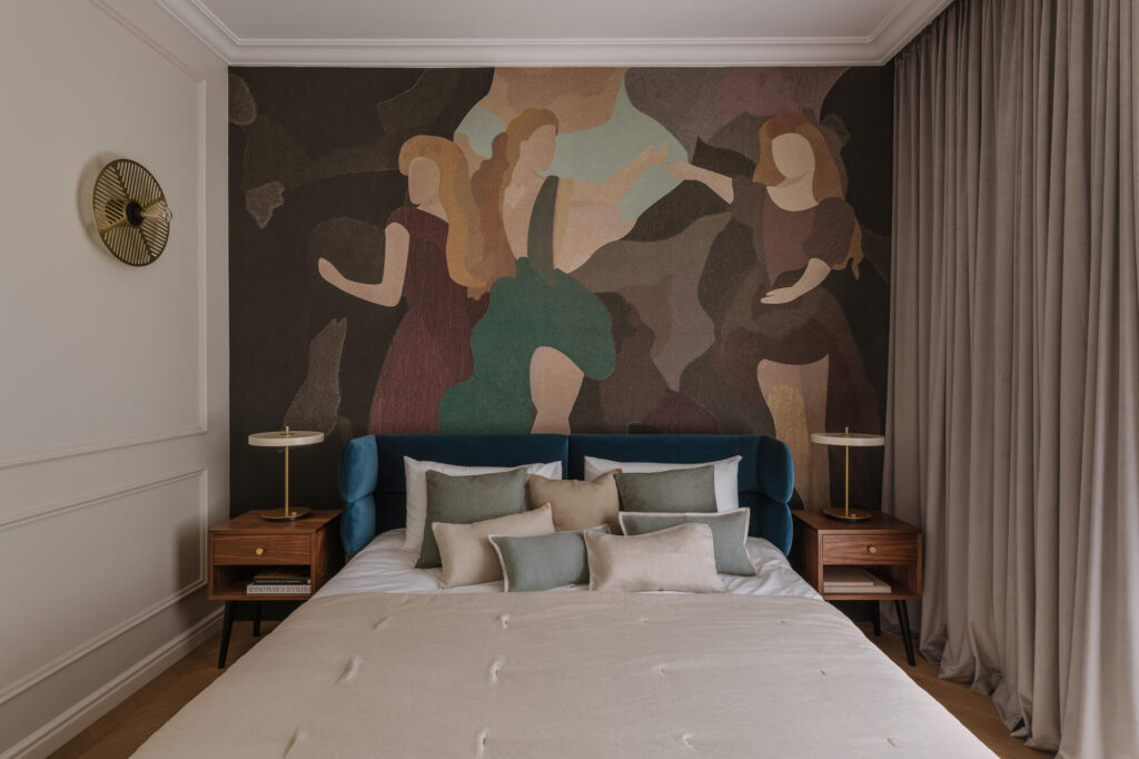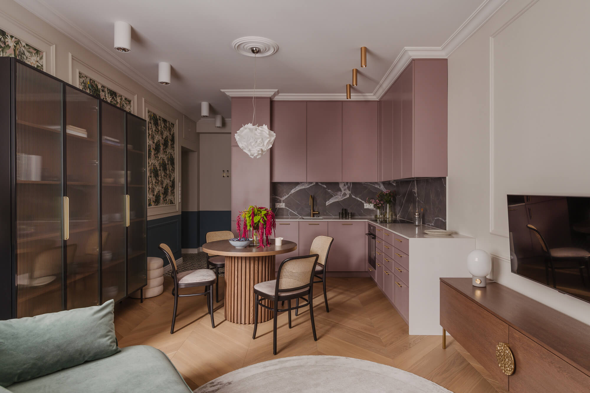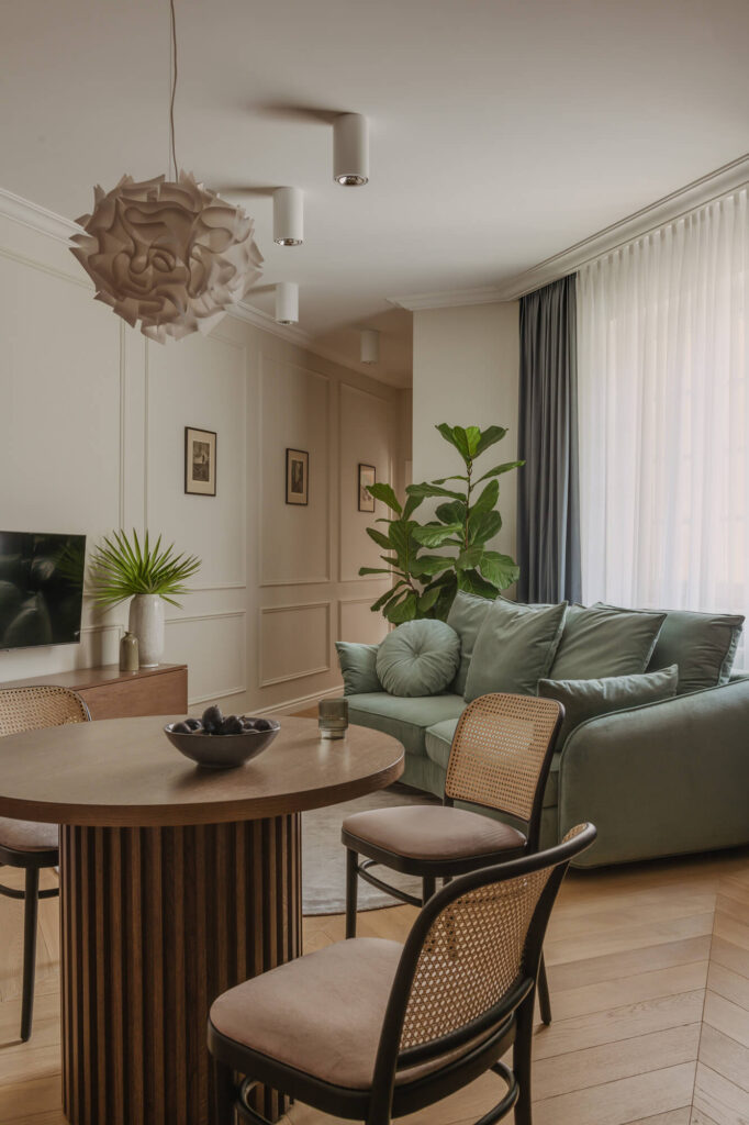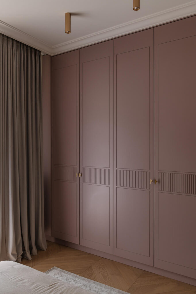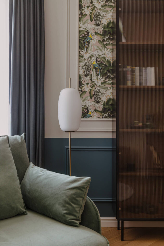 Prawdziwy azyl i miejsce odpoczynku stworzone w starej kamienicy – to projekt Skawińska. Królują tu kolory lila, niebieski i zielony, zdefiniowane przez tapetę Pierre’a Frey’a, z motywem papug i roślin, widoczną na jednej ze ścian salonu. Meble do mieszkania zostały zaprojektowane przez naszą pracownię. Zarówno do ich wykonania, jak i do wykończenia całego lokum, wykorzystano materiały czerpane z natury – drewno, mosiądz czy kwarc. Nie zabrakło również złotych akcentów, które nadają elegancji i szyku.
