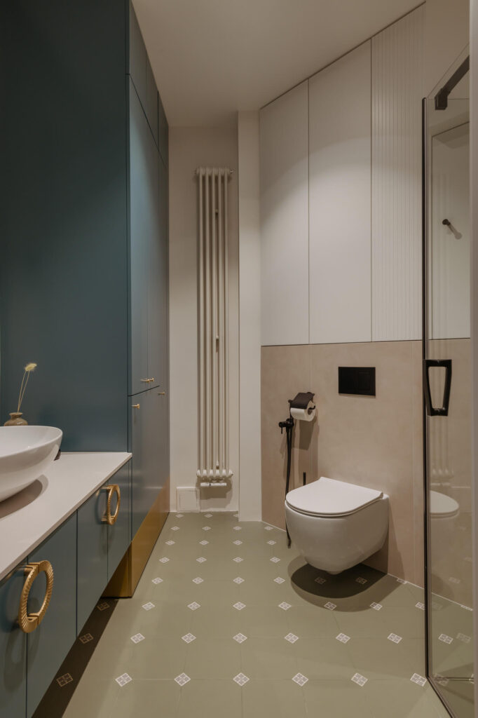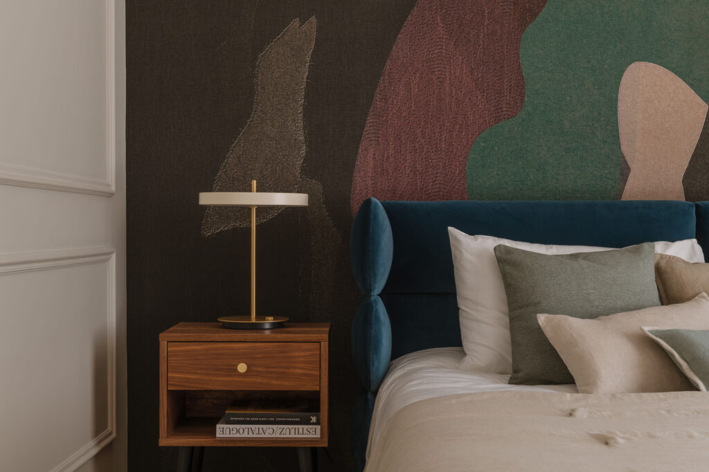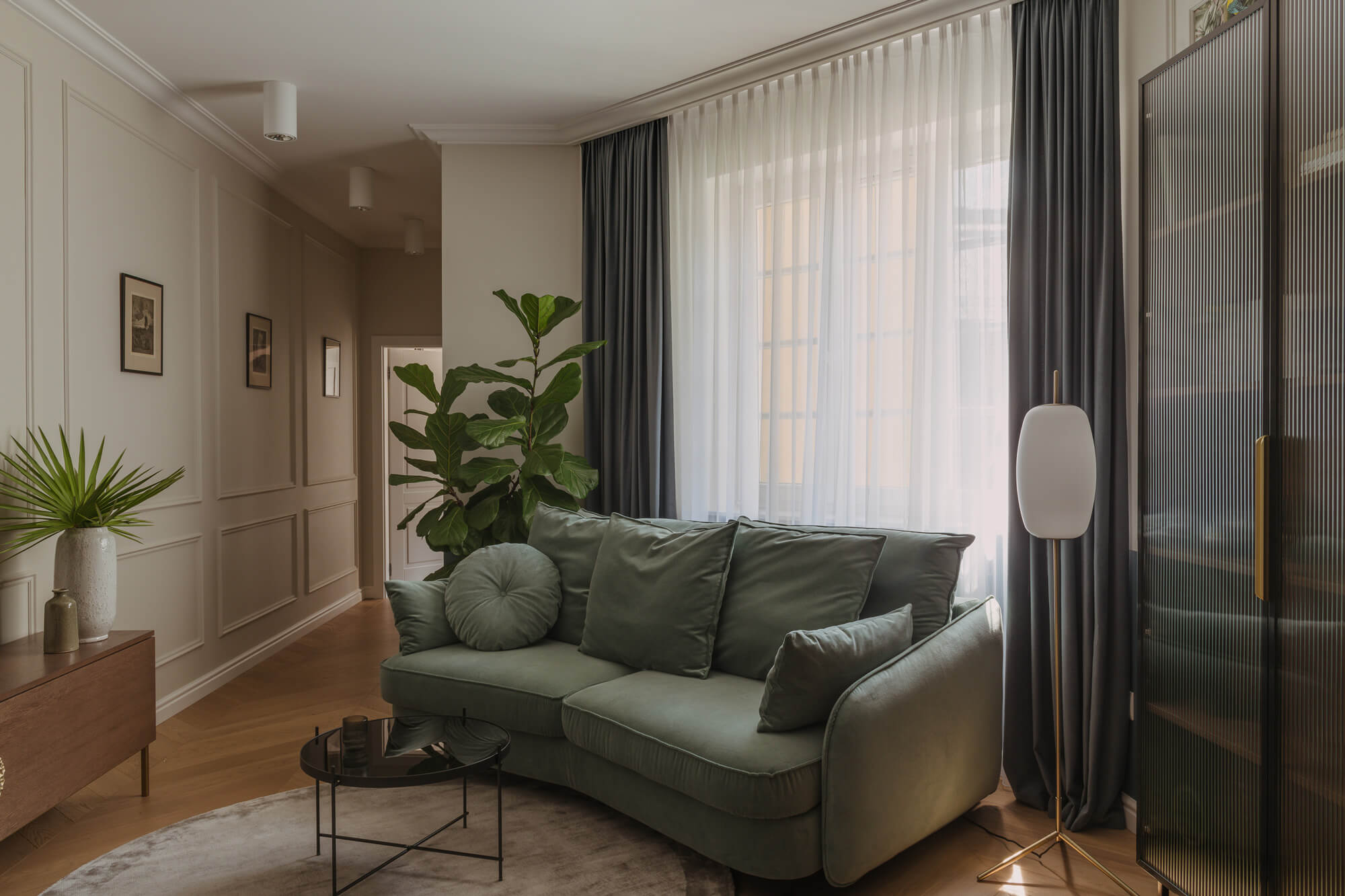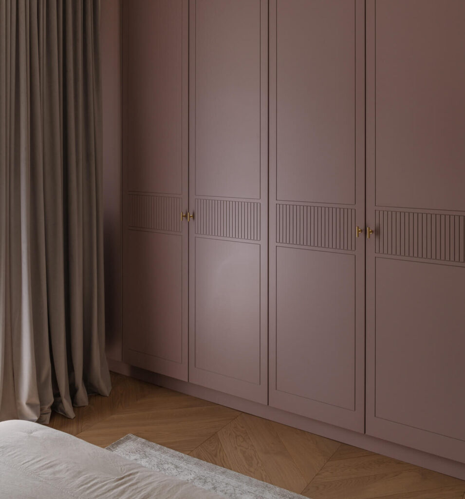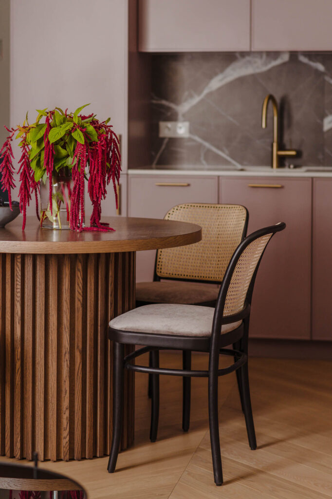 Prawdziwy azyl i miejsce odpoczynku stworzone w starej kamienicy – to projekt Skawińska. Królują tu kolory lila, niebieski i zielony, zdefiniowane przez tapetę Pierre’a Frey’a, z motywem papug i roślin, widoczną na jednej ze ścian salonu. Meble do mieszkania zostały zaprojektowane przez naszą pracownię. Zarówno do ich wykonania, jak i do wykończenia całego lokum, wykorzystano materiały czerpane z natury – drewno, mosiądz czy kwarc. Nie zabrakło również złotych akcentów, które nadają elegancji i szyku.